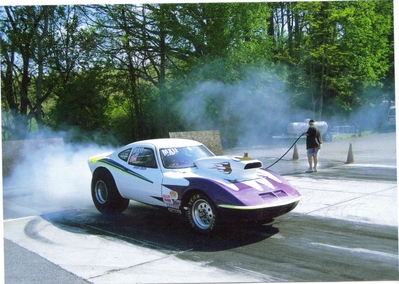 1972 Opel GT. Full round tube chassis. Front suspension is stock Opel(needed for class). 4-link rear with 9 inch. Full spool, 4.55 gear, moser axles. Engine is SBC 350. bored and stroked to 403. Aluminum dart heads with extensive port job. Full roller valve train Harland Sharp rockers. Comp cam don't remember the exact specs, but I can get them from the builder. Billet stud girdles. Block grouted to bottom of water pump. JE pistons, 6.0 inch H-beam rods, Forged Eagle 400 crank. Motor is about 14:1 compression. SFI balancer and flexplate. Victor intake with 850 Holley. MSD 6AL box, MSD pro billet distributor. Electric water pump. Griffin radiator. Fuel system is way overkill for this motor. Previous motor was on alchohol. Aeromotive pump,filter and regulator. All steel braided line and AN fittings. Transmission is power-glide profesionly built. Has tranny brake, 4500 hughes converter, JB ultrabell. Tranny brake has never been used. Tranny itself has about 15 passes. This motor was proffesionally built by Pete's machine shop in Muskogee,Ok. This motor has never been to the track. Last motor went 9.88 @ 147 way fat on alchohol. This is the same build, but all forged and on gas. according to the builder, this motor should be capable of 9.50's.